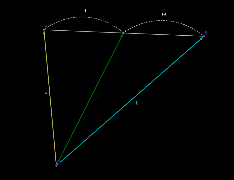 벡터의 내분은 0 < t < 1 일때 주어진 두 점을 특정 비율(1 - t : t)로 나누는 과정을 말하며 다음과 같이 정의한다.